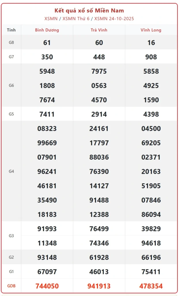 Chốt lô Bình Phước đặc biệt ngày hôm nay 25/10/2025 như sau: